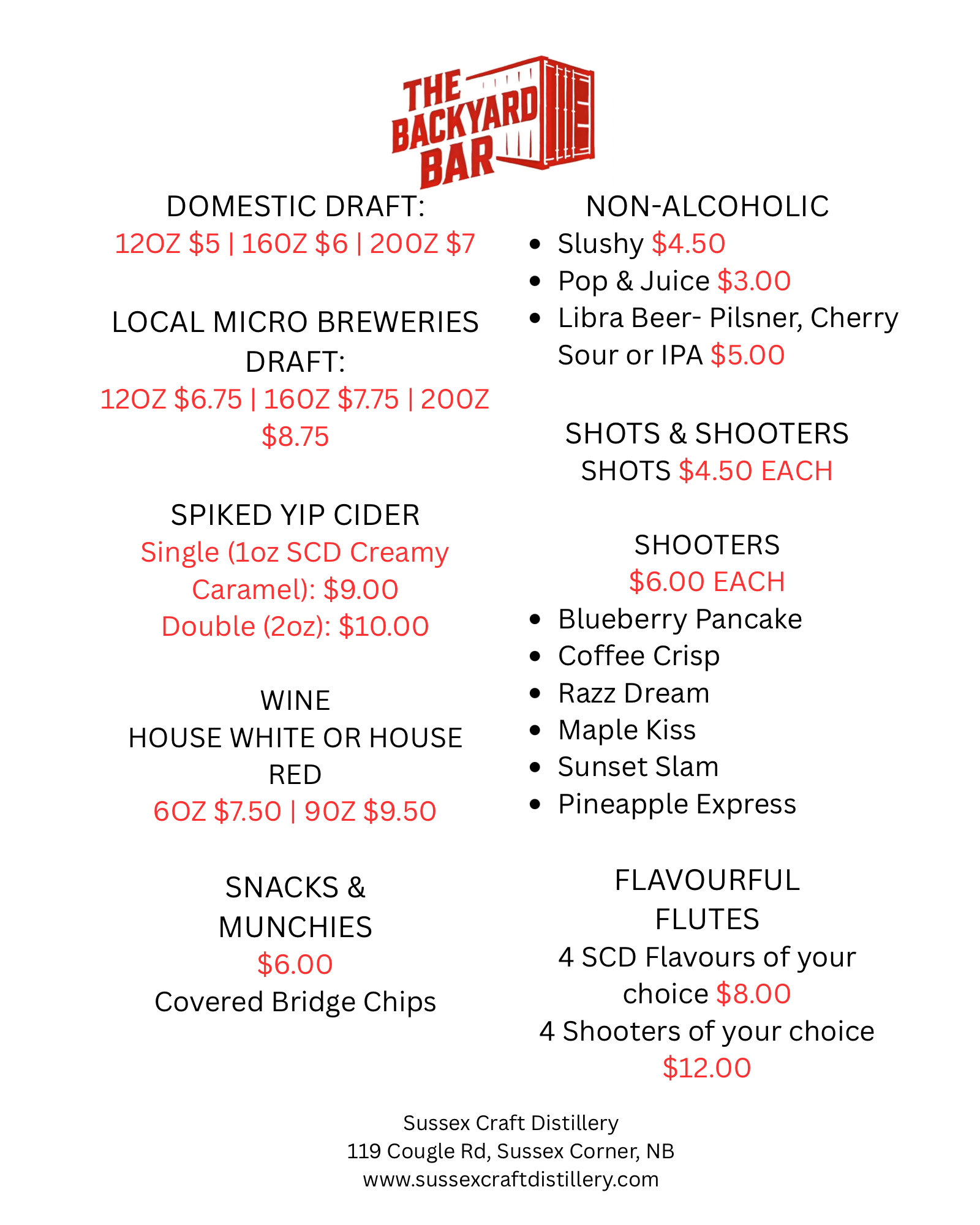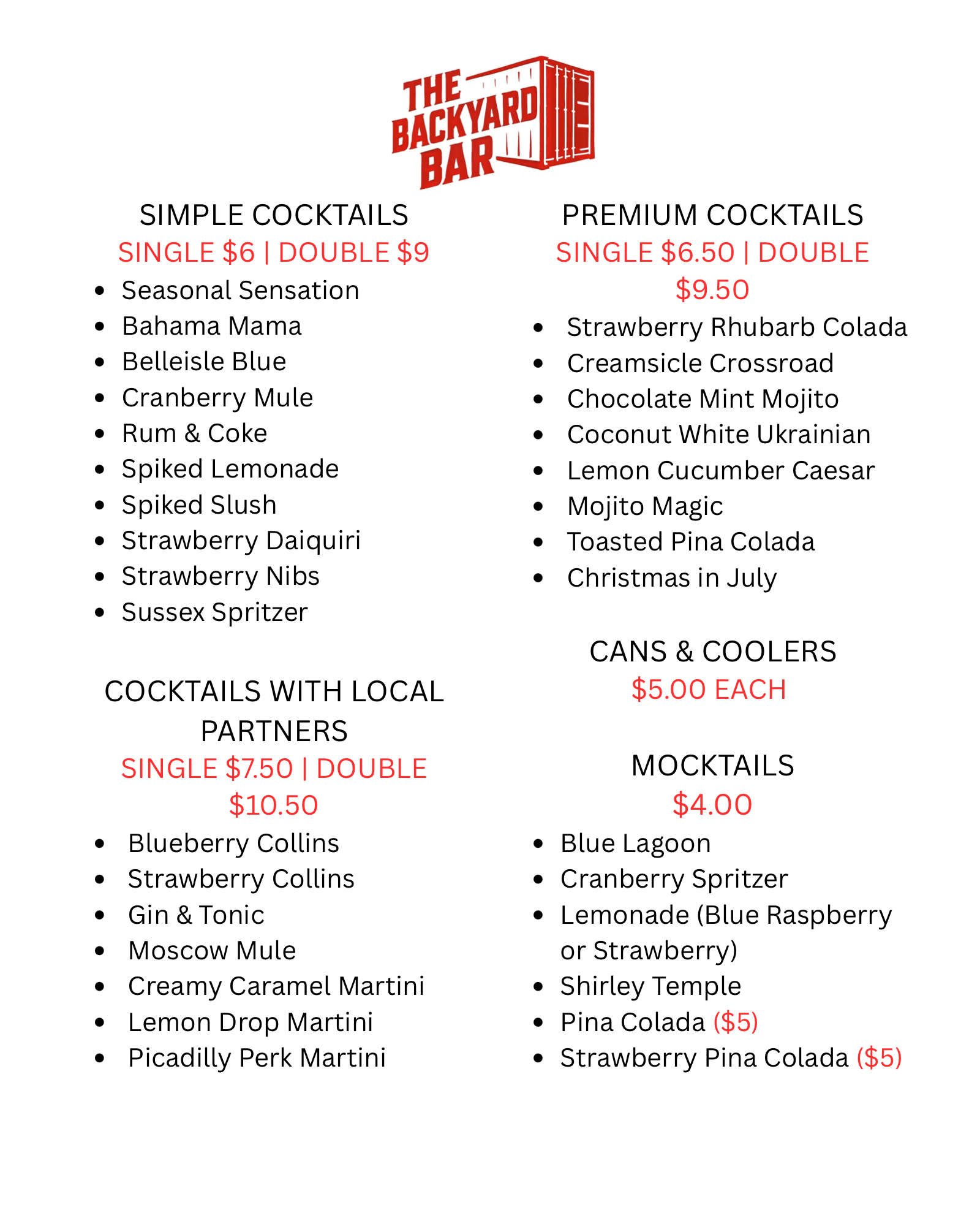 The Backyard Bar Menu